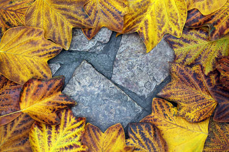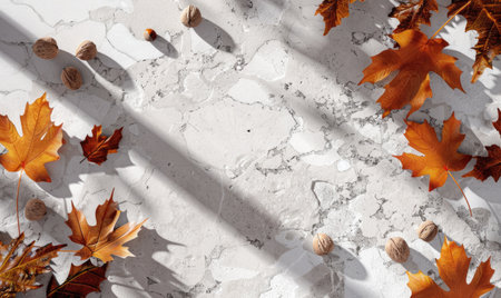 Colorful golden leaves and dark stones arranged artistically on a light marble background add elegance.