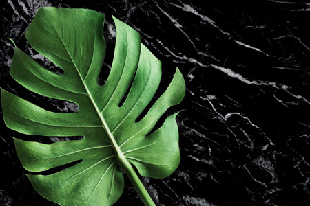 beautiful texture of black marble stone with monstera leaf.For decorative presentation ideas