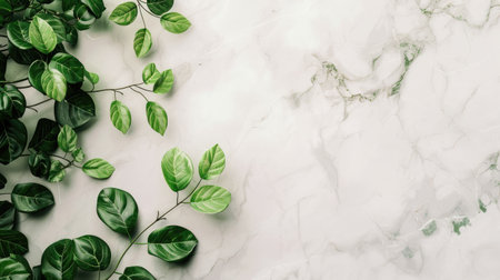 A flat lay image featuring green leaves arranged on a white marble surface.