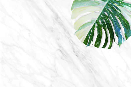 Variegated Monstera Leaf on Natural White Marble Background Top View with Copy Space
