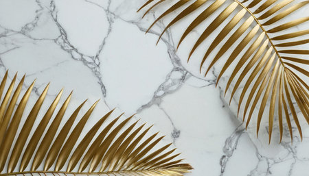 Elegant gold leaves on a dark marble background create a sophisticated atmosphere. Perfect for design projects, wallpapers, or decor elements that want to convey luxury.