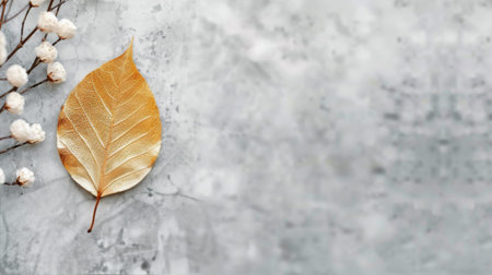 A golden leaf rests beside delicate white berries on a smooth gray surface, illuminated by soft, natural light that enhances the textures and colors of the natural elements.