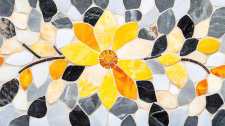 Stone mosaic floral design featuring yellow petals on gray background in a symmetrical close-up