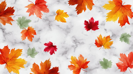 Scattered colorful autumn leaves are displayed against a textured marble backdrop. The composition features a variety of leaf colors, including red, orange, yellow, and green. This image showcases a natural aesthetic, ideal for seasonal themes and decorative projects. It could be used for various commercial or editorial applications.