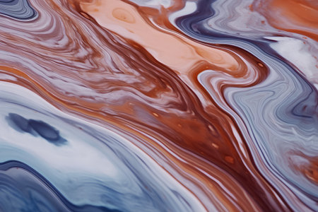 A detailed abstract showcasing the marbling technique with a rich combination of red, white, blue, and brown colors. The paints are mixed in a fluid manner, creating intricate, flowing patterns and organic curves that give the a sense of depth and movement. The surface is smooth and glossy, highlighting the vibrant colors and the unique textures formed by the swirling liquids. is a testament to the beauty of abstract liquid