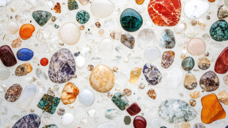 This image features a vibrant assortment of polished stones and gemstones resting on a light surface, showcasing diverse colors and textures. Perfect for decorative use.