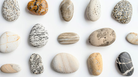 A collection of various stones of different shapes, sizes, and colors is arranged neatly, showcasing natural textures and unique patterns. Each stone reveals its distinct beauty.