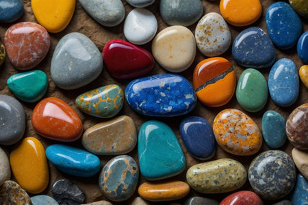 Detailed view of a variety of brightly colored pebbles in a close-up shot, showing the intricate patterns and textures.