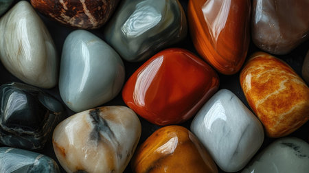 A colorful assortment of polished stones rests on a reflective surface, showing a variety of textures and hues under soft lighting in a serene setting.