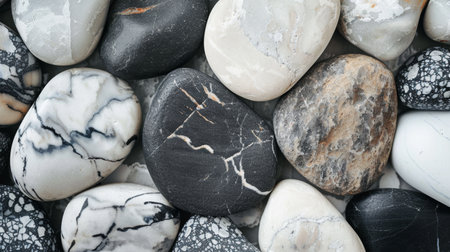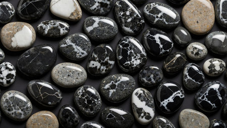 This image displays a collection of polished stones featuring intricately black, white, and gray patterns, laid out on a dark background, highlighting their unique textures and colors. AI generated image