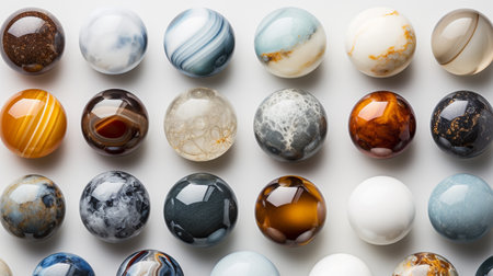 A photo of a carefully curated marble selection displayed on a white surface, highlighting the beauty and variety of marbles
