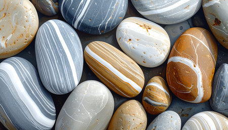 A collection of smooth, rounded pebbles with distinct striped patterns arranged on a dark textured surface. The stones display various earth tones, symbolizing balance, zen, and natural diversity.