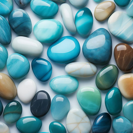 rounded marble pebble stones in a soothing aqua colour are beautifully arranged in a flat lay, showcasing their photorealistic textures and intricate details, perfect for backgrounds, textures, or design elements in interior design, home decor, and architectural visualizations. ai generated
