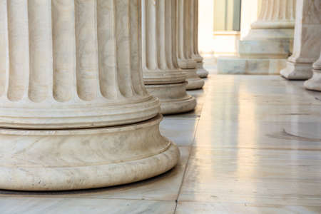 Pillars in a row. Classic columns white marble, Justice building, court entrance colonnade, close up view