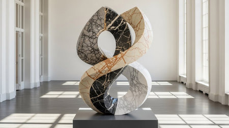 An abstract, polished marble sculpture with an infinity loop form showcases contrasting black, white, and beige...