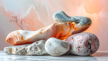 Set of natural stone and marble on white marble table with colorful wall background