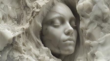 This artwork features an abstract sculpture of a woman's face seamlessly integrated into a textured marble wall, capturing modern minimalism and elegance.