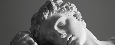 Monochrome sculpture of Hypnos, the Greek god, with a peaceful and calming expression, representing the essence of sleep.