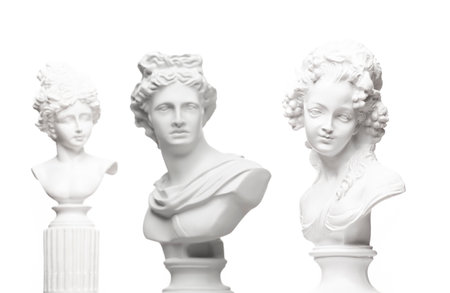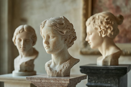group of busts of David stand on a shelf. sculptors workspace. antique plaster busts