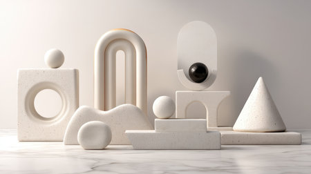An outdoor arrangement showcases artistic busts in varying shades of green and white on white pedestals. Surrounding greenery enhances the tranquil atmosphere of this modern display.