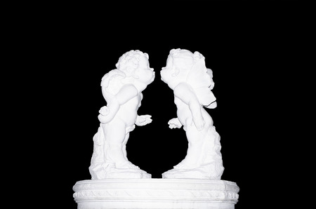 The marble sculpture of young roman couple . Close up of a sculpture of a man and women gazing lovingly into each others eyes. Young naked Roman woman and man in unity isolated on white background