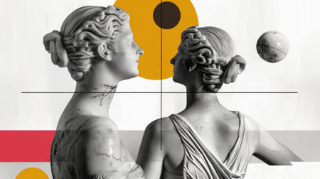 Set of antique statue busts in different headwear against black background with abstract colorful elements. Contemporary art collage.