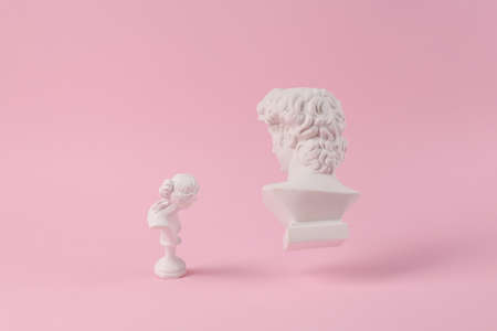 Levitating Antique Plaster busts of David and Venus on pink background with shadow. concept pop. Minimal still life photography