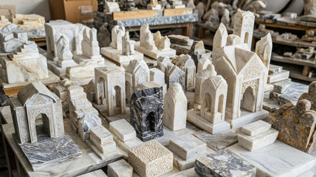 Marble Buddha statues outside of factory in Mandalay in Myanmar