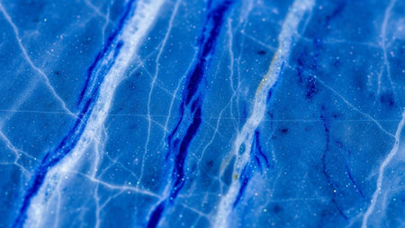 Detailed macro view of a vibrant blue marble surface with white and dark blue veins and scattered glitter.