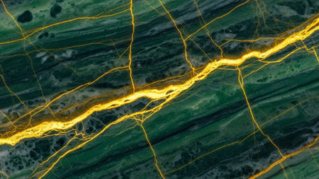 Close-up macro view of deep green marble showcasing intricate, shimmering golden veins and natural cracks forming a...