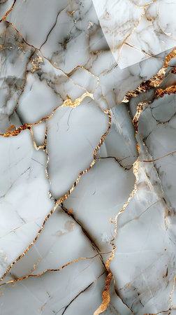 Seamless luxurious white and gray natural stone background with complex swirling patterns and thick, brilliant paths of reflective gold metallic material simulating kintsugi style.