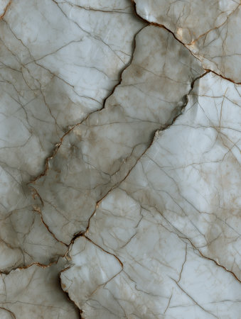 Cracks and veins create a striking design in a piece of white stone, showing shades of gray and brown in natural light, highlighting the beauty of nature.