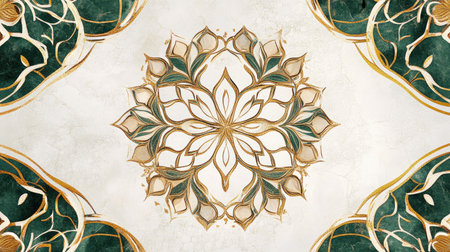 This elegant floral mandala design features green leaves and gold accents, perfect for backgrounds or home decor, showcasing intricate details and symmetry.