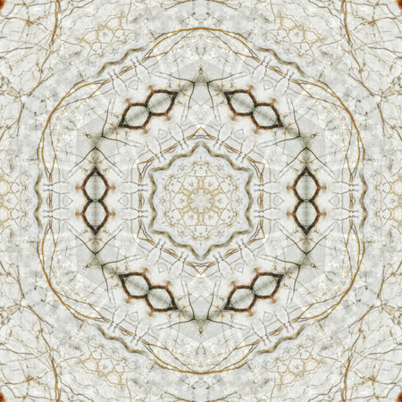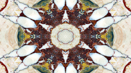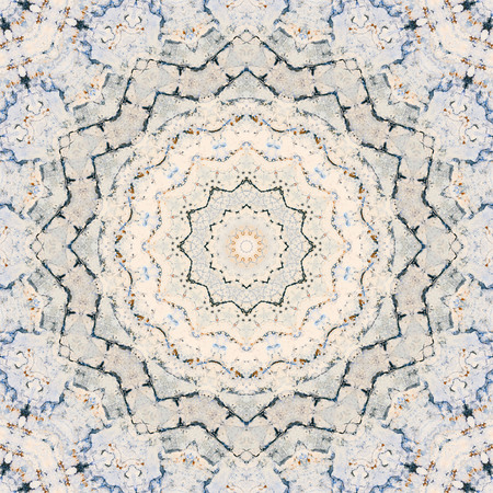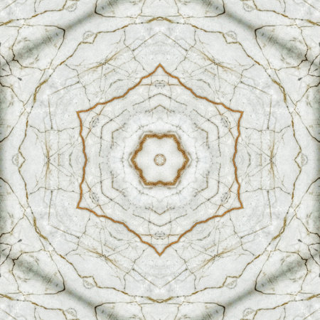 marble background with an artistic arrangement of stone ceramic tiles, resembling a mandala-inspired pattern.