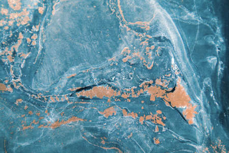 Abstract fluid art background navy blue and bronze colors. Liquid marble. Acrylic painting on canvas with turquoise lines and gradient. Alcohol ink backdrop with wavy pattern.