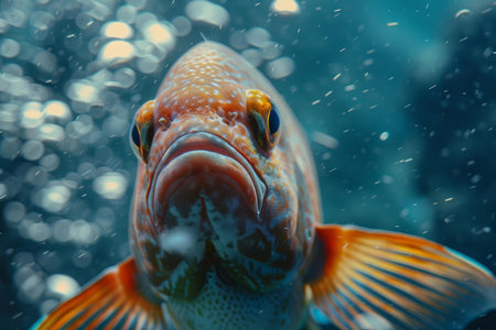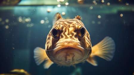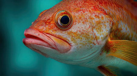 This mesmerizing image showcases a vibrant orange fish gracefully swimming in clear water. The intricate details of its scales and unique expression highlight the beauty of marine life.