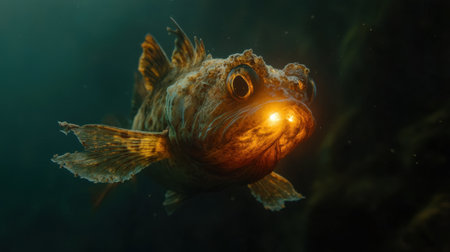 A mesmerizing underwater scene featuring a unique bioluminescent fish that illuminates its surroundings in a dark ocean environment, highlighting the beauty of marine life.