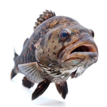 Underwater closeup of a predatory fish with open mouth, murky water, eerie lighting, detailed textures, natural habitat setting