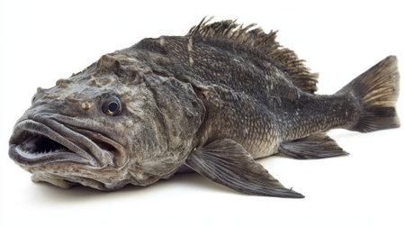 Atlantic Wolffish known for its distinctive appearance displays its unique features while swimming in its natural environment. This species showcases its prominent teeth and rugged skin.