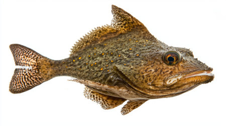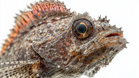 Stonefish known for its camouflaged appearance and venomous spines is captured in detail highlighting its unique features against a bright background.