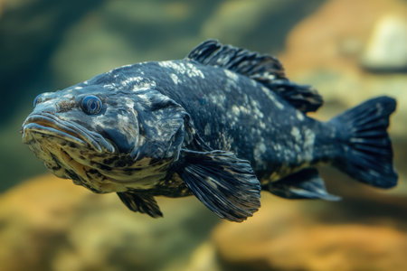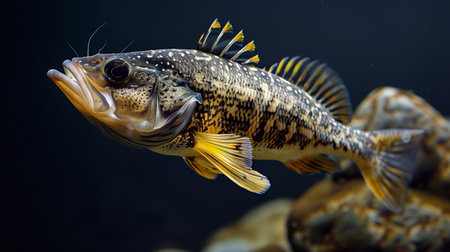 The fish with its distinct black and white speckles moves effortlessly in the calm waters of a freshwater environment. Surrounded by smooth stones and natural elements it showcases its beautiful fins and intriguing facial features embodying the serenity of aquatic life in its natural habitat.