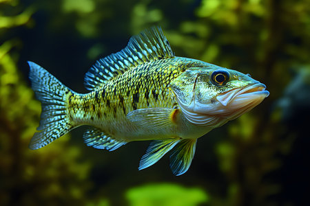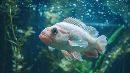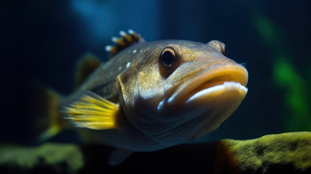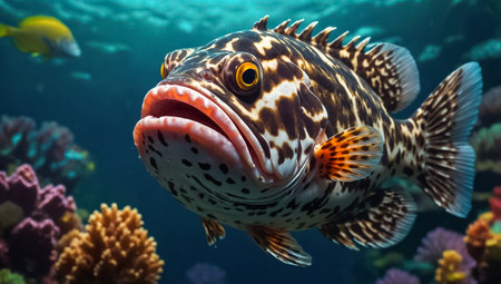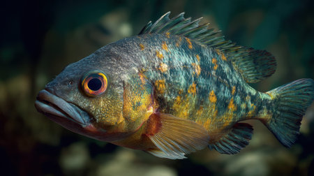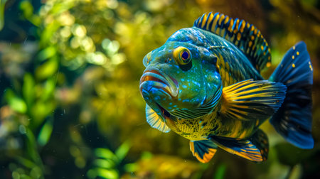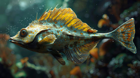 Colorful close-up of a spotted fish swimming among rich aquatic vegetation, showcasing intricate scale patterns and fins. captures the serene beauty of underwater ecosystems and the vibrant life within them. Generative AI