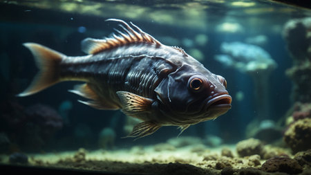 A strange and unsettling fish swims alone in a dark aquarium tank. Its rough scales, sharp fins, and haunting expression evoke mystery and unease. The dim lighting and underwater environment enhance the surreal, otherworldly feel of this deep-sea creature, often referred to as a doomsday fish.