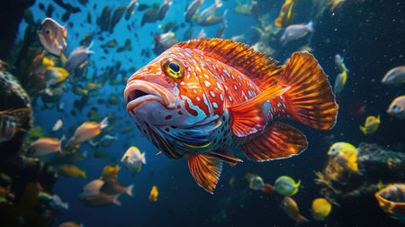 Underwater photograph of a striking sea fish with vivid colors, surrounded by schools of smaller fish and marine vegetation -