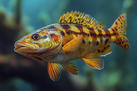 Striped yellow perch swimming gracefully in an underwater setting, showcasing its vivid colors and distinctive pattern. the serene environment adds depth, the fish's natural beauty and intricate details. Generative AI