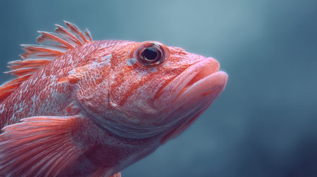 A stunning close-up of a red fish gracefully swimming underwater, highlighting its intricate features and vibrant colors against a serene ocean backdrop.