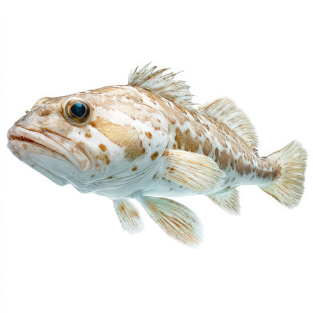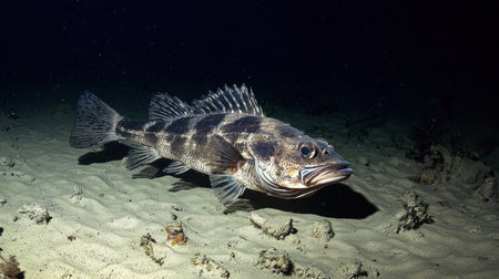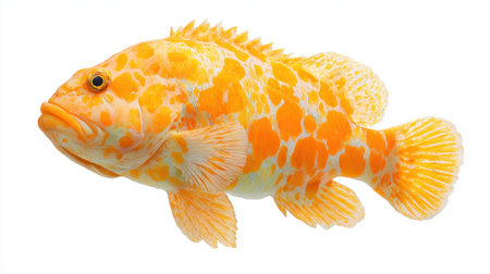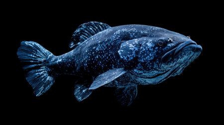 A golden-colored fish, possibly a grouper, is depicted against a stark black background. The image showcases detailed textures and scales, with well-defined fins and eyes. The composition utilizes high contrast lighting, enhancing the visibility of the fish. Suitable for various design projects, including educational resources or nature-themed illustrations.