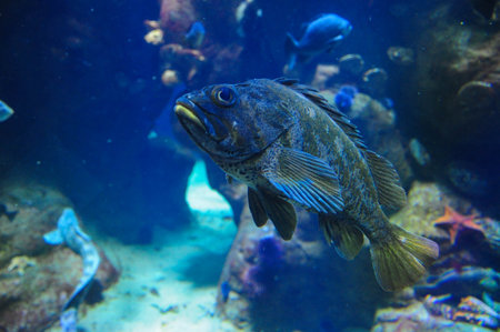 A vibrant grouper fish is seen resting near coral formations in a marine environment. The image showcases the fish's intricate blue and yellow patterns, contrasting with the colorful coral. The underwater lighting illuminates the scene, hinting at a natural habitat. Suitable for various editorial and commercial applications related to marine biology or conservation.