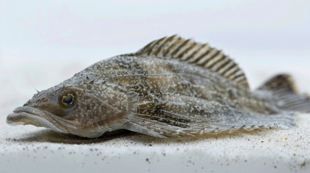Turbot is prominently featured against a clean white background highlighting its unique body structure and coloration. This flatfish is known for its culinary value.