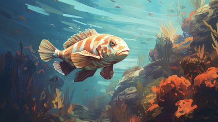 a fish swimming in the ocean is depicted in this digital painting. created using the cryengine, the artwork showcases flat illustrations with naturalistic depictions of flora and fauna. the color palette predominantly features shades of red and amber. the painting was captured using a canon eos 5d mark iv camera, and the fish is beautifully striped. ai generated